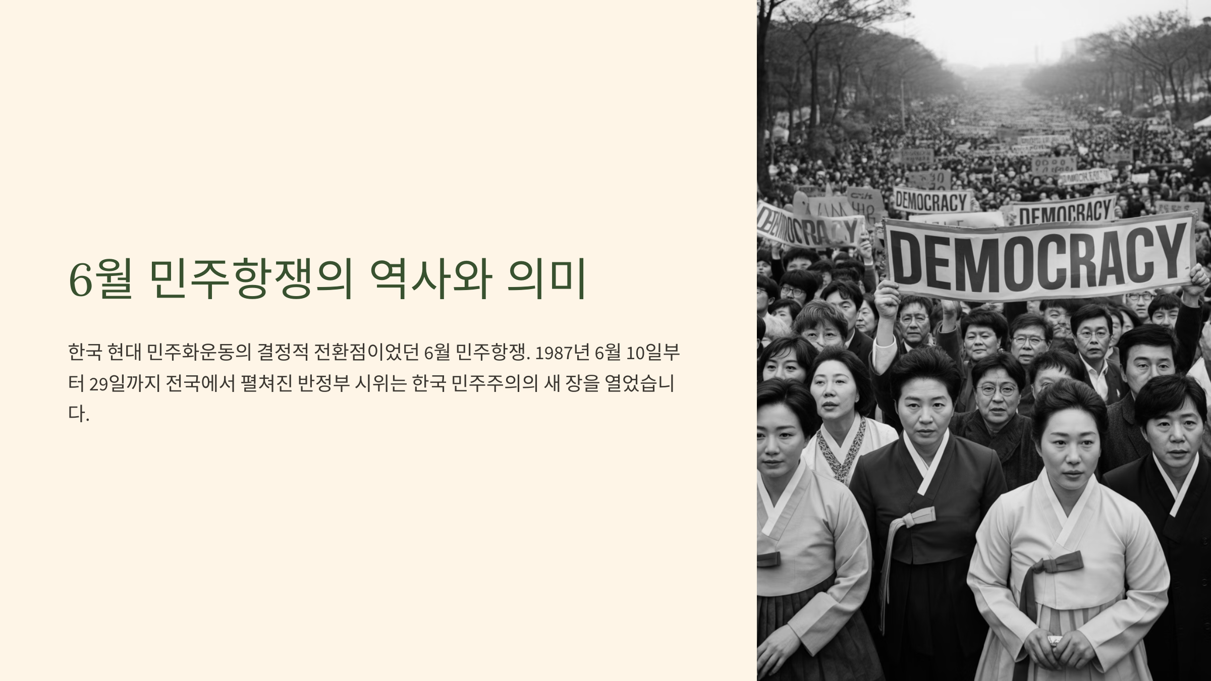 2025년인 지금, 우리는 여전히 변화하는 사회 속에서 선택을 하고 있어요. 그때처럼 또다시 거리로 나서진 않아도, 작은 목소리 하나, 한 표의 힘이 사회를 바꾼다는 걸 기억한다면 6월 항쟁의 정신은 지금도 살아 있어요. 그건 아주 멋지고 강한 힘이죠.