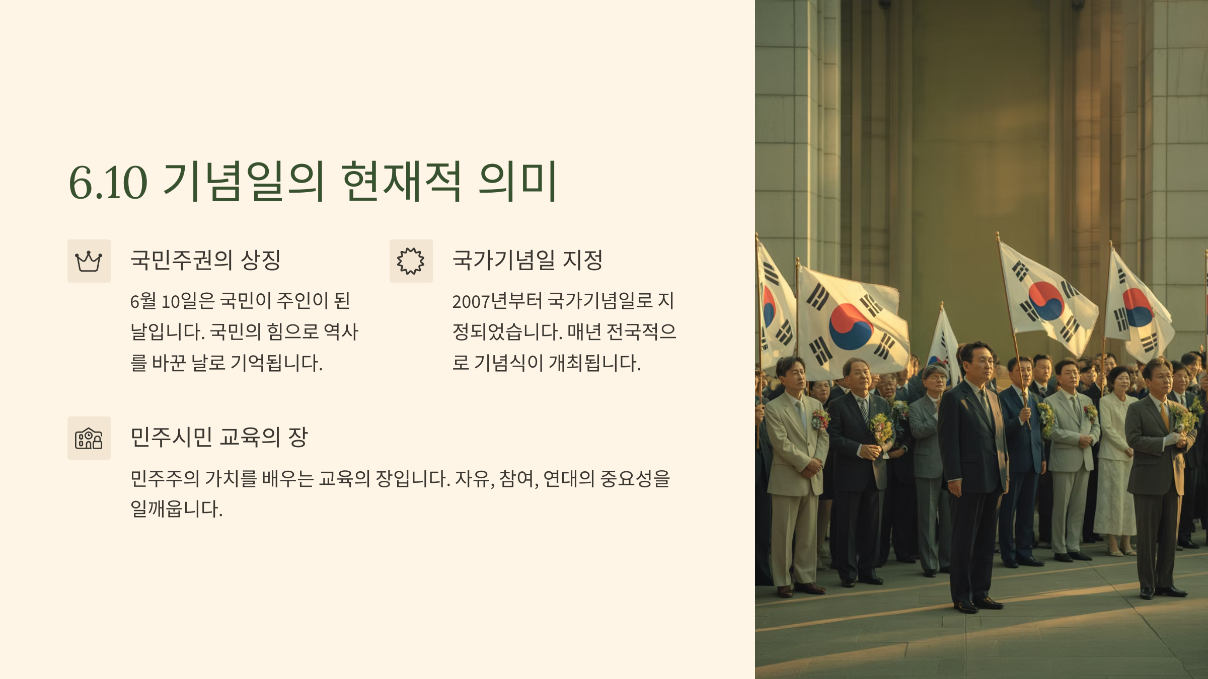 🎗️2007년, 6월 10일은 ‘민주항쟁기념일’로 정부에 의해 공식 지정됐어요. 국가보훈처가 아닌 문화체육관광부 주관으로 진행되는 이 날은, 단지 과거를 기념하는 날이 아니라, 민주주의의 가치를 다시 되새기는 시간이 되었답니다. 많은 사람들이 이날을 통해 민주주의의 본질과 시민의 책임을 다시 생각하게 돼요.