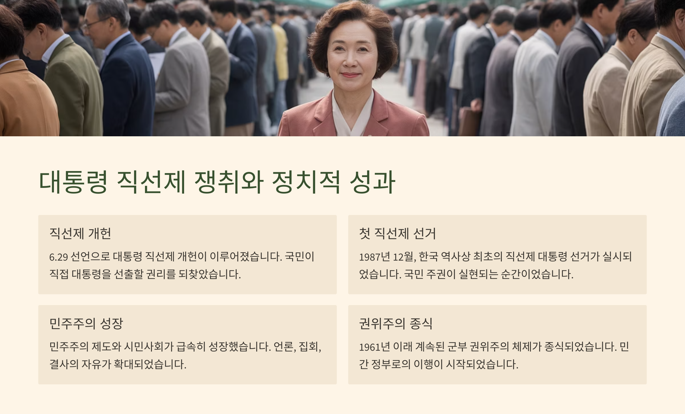 🗳️6월 민주항쟁의 가장 큰 성과는 바로 대통령 직선제의 도입이에요. 기존에는 국민이 아닌 간접선거로 대통령을 뽑는 ‘체육관 선거’가 계속되었는데, 국민들은 이 제도가 민주주의에 어긋난다고 강하게 반발했어요. 결국 전두환 정권은 국민의 요구를 수용할 수밖에 없었고, 노태우가 발표한 6·29 선언을 통해 대통령 직선제를 약속하게 되었죠.