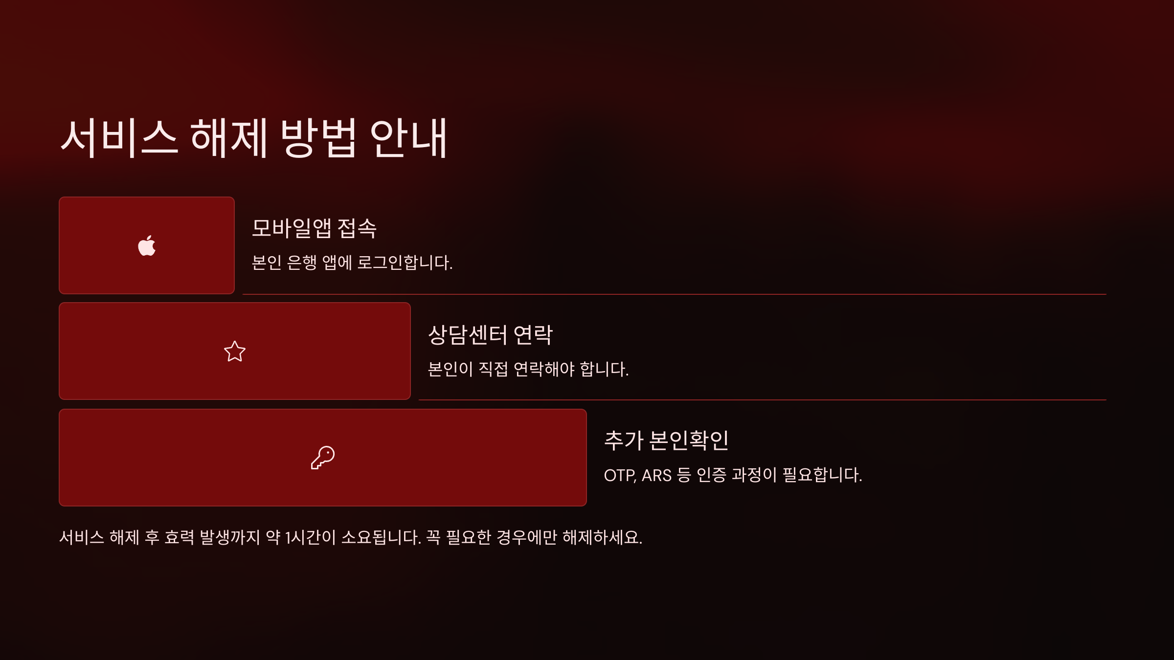 해제 방법은 신청 방법과 거의 같아요. 온라인, 오프라인, 콜센터 모두 가능해요. 다만 해제 시에는 금융사 측에서 조금 더 엄격하게 본인 확인을 진행해요. 요즘 금융사기가 많아서 보안을 강화한 거예요.